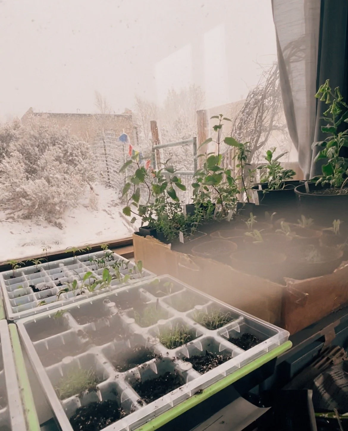 The blackberry is the only thing in the ground right now — steady and green, holding its own after this week’s surprise snow. Everything else is waiting, gathering strength on windowsills and in trays. I’ll plant the rest next week, under the full moon.